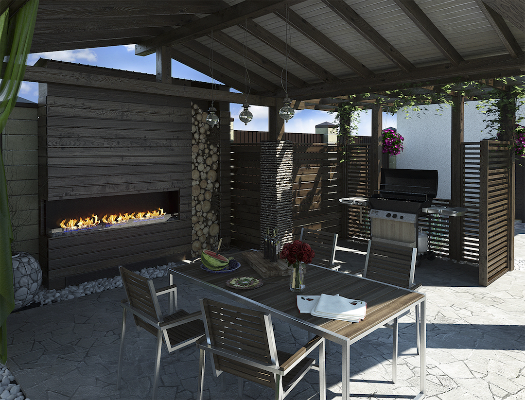 Built-in fireplace: Why not have a fireplace outside instead of an actual fire pit? A permanent fire place is a safe and striking addition to any outdoor space. If you are opting for built-in, make sure that you place it accordingly so there is plenty of open room for seating around it! If you have a dining table outside, plat it so that you can enjoy your meals without getting too cold.