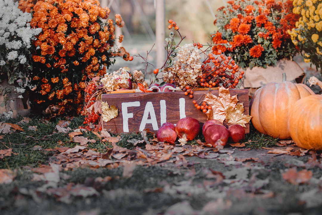 If you are one of the lucky ones with a green thumb, now is the ideal time to plant flowers outdoors. Add small planters around the outdoor space with all kinds of yellow, orange, and red arrangements. Also, be sure to utilize green shrubbery for a natural, calming aesthetic. Fill vases and containers with branches as well to add to the rustic, earthy feel of harvest season. You can also find gourds and pumpkins at most grocery stores to real get into the season (they will last months, as well!).