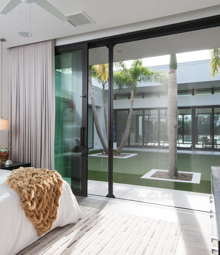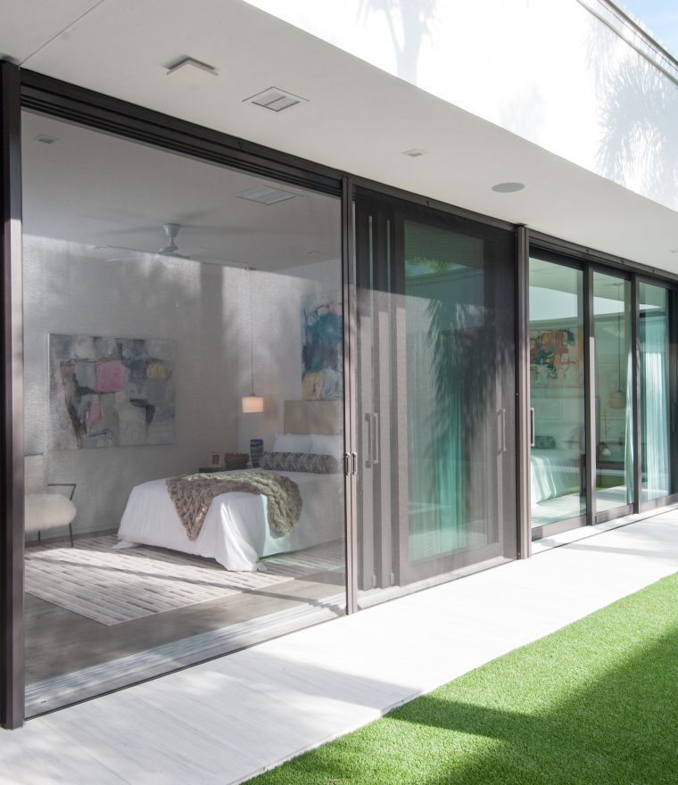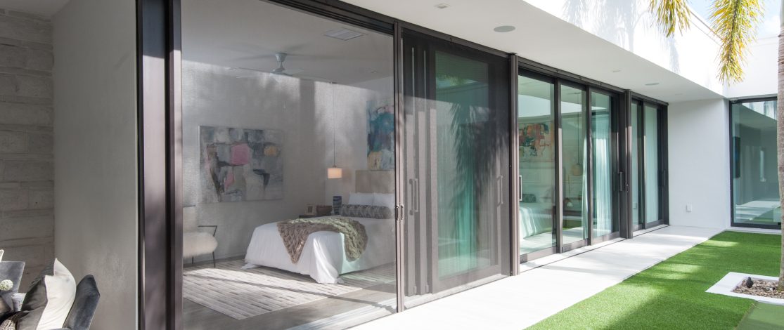 Two 12-ft retractable screens come together to screen these 24-ft wide openings. When not in use, they retract completely into their housing allowing the homeowner to enjoy their expansive view.