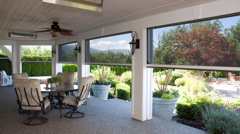 To enjoy their newly remodelled porch year-round, the homeowners needed a screening system that would block out insects but also retract when not in use for a clear view to the gardens.