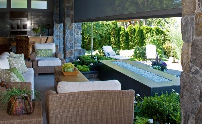 Located in Kelowna, BC, this private residence takes summer living completely outdoors. With lush gardens, fire pit, water feature and views to Okanagan Lake, the homeowners have turned their back porch to a true retreat. Carefully selected outdoor furniture and fully equipped barbeque and kitchen help to create a multi-purpose space that represents outdoor living at its best.