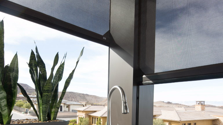 Inside frame mount (under header) installation detail of motorized screen with standard side tracks